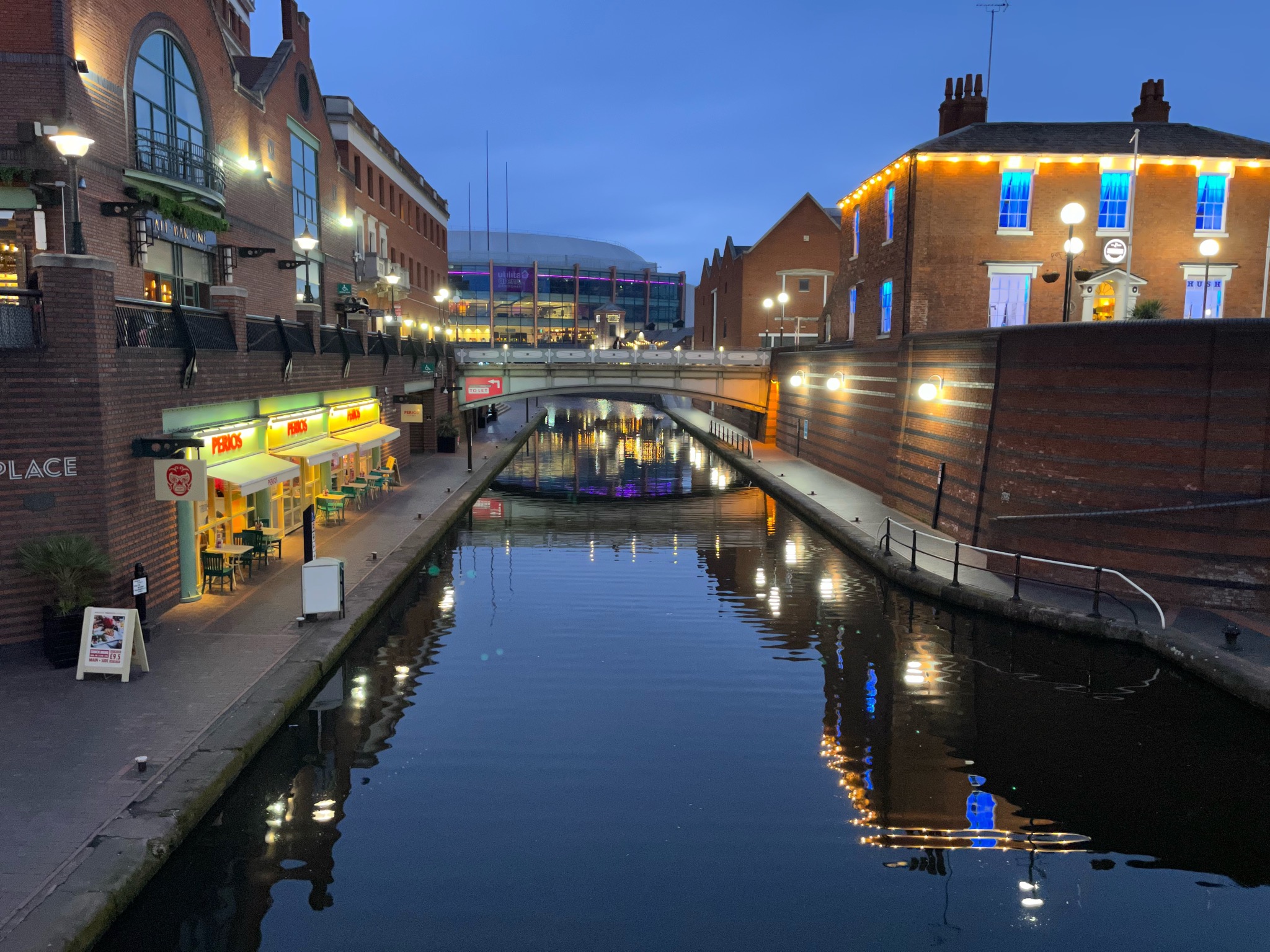 Next door to the ICC in Birmingham is a canal and there is a bridge across there from Brindley Place, and it would appear quite often when crossing the bridge I would take a photograph down the canal looking towards the what was the NIA (National Indoor Arena) and is now known as the Utilita Arena Birmingham.